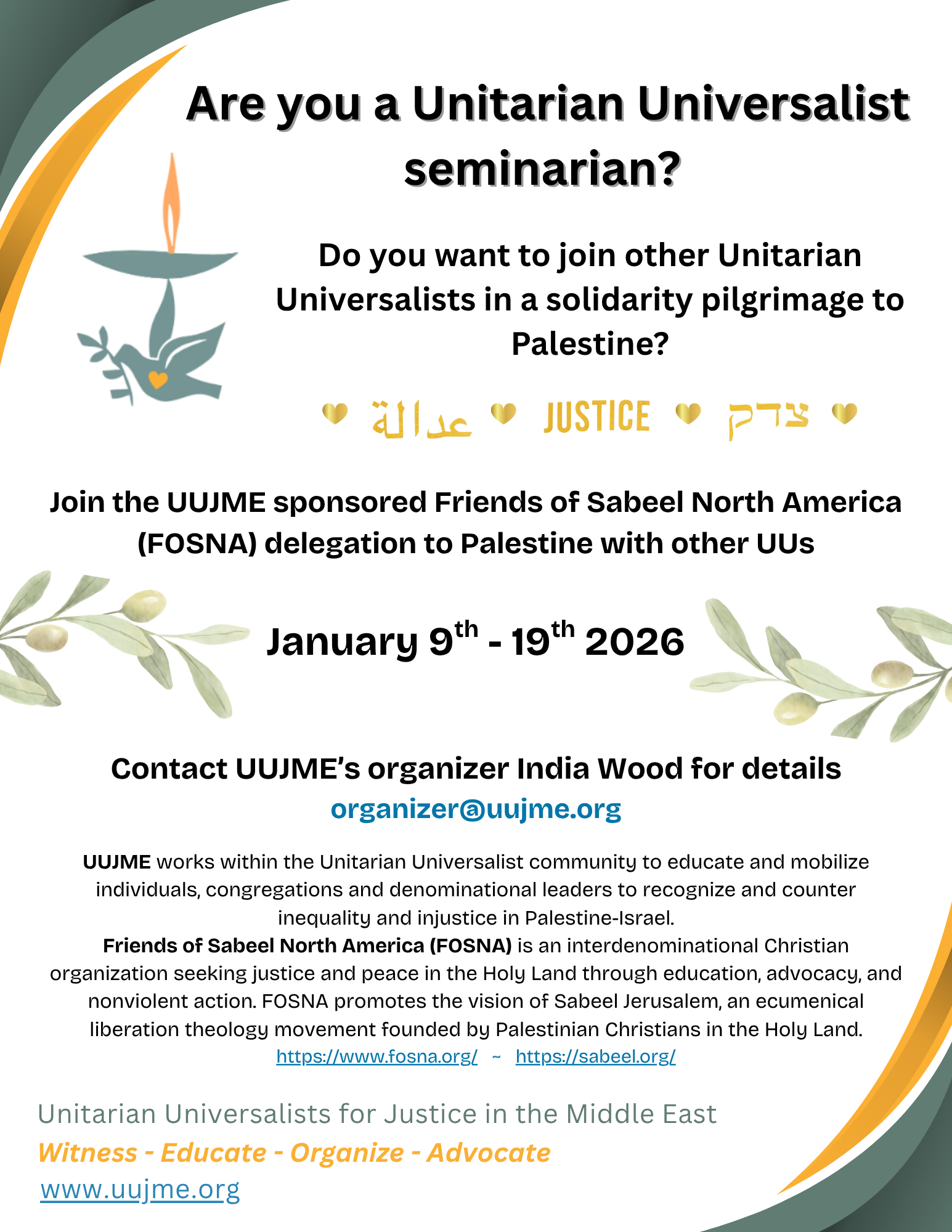 UUJME is offering travel scholarships to UU young adults aged 18-35 for trips to the Middle East. The Young Adult Travel Scholarship supports young people to take part in activities that will help further UUJME’s mission and the cause of justice, peace, and human rights in Israel-Palestine. Scholarship applicants may request up to $3000 in funding assistance to help cover trip costs, although all scholarship awards are subject to available funding.